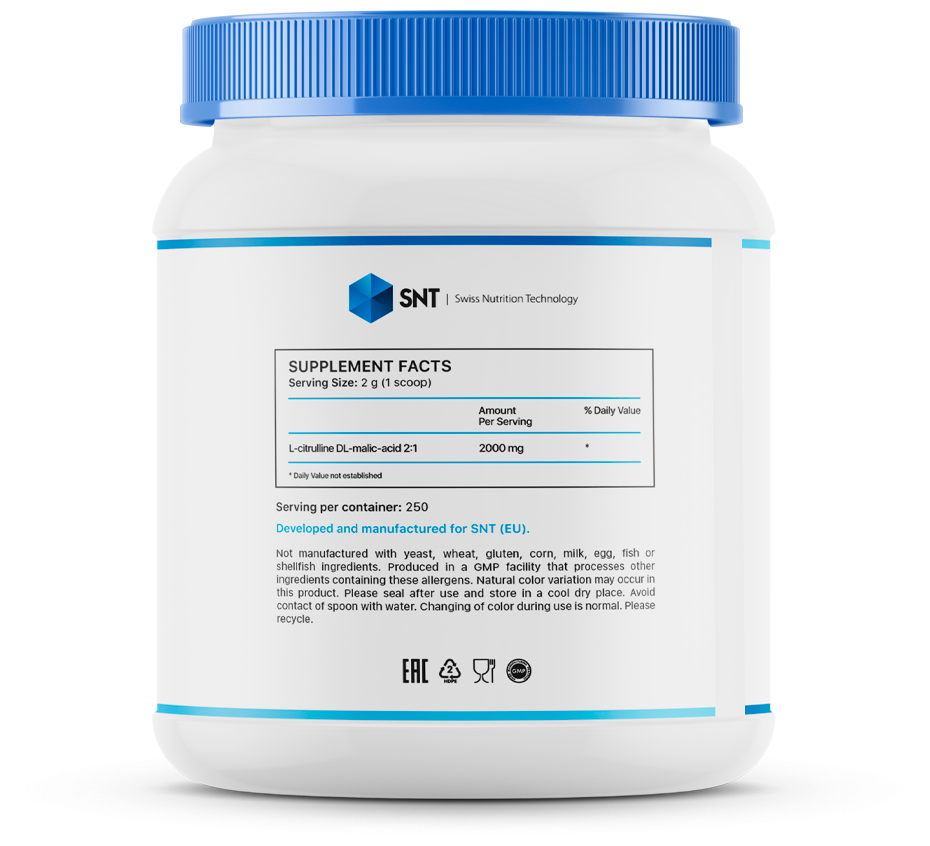 - Улучшенный кровоток - Citrulline Malate может улучшить кровоток и доставку кислорода в мышцы. Это может помочь уменьшить мышечную боль и улучшить время восстановления после упражнений.