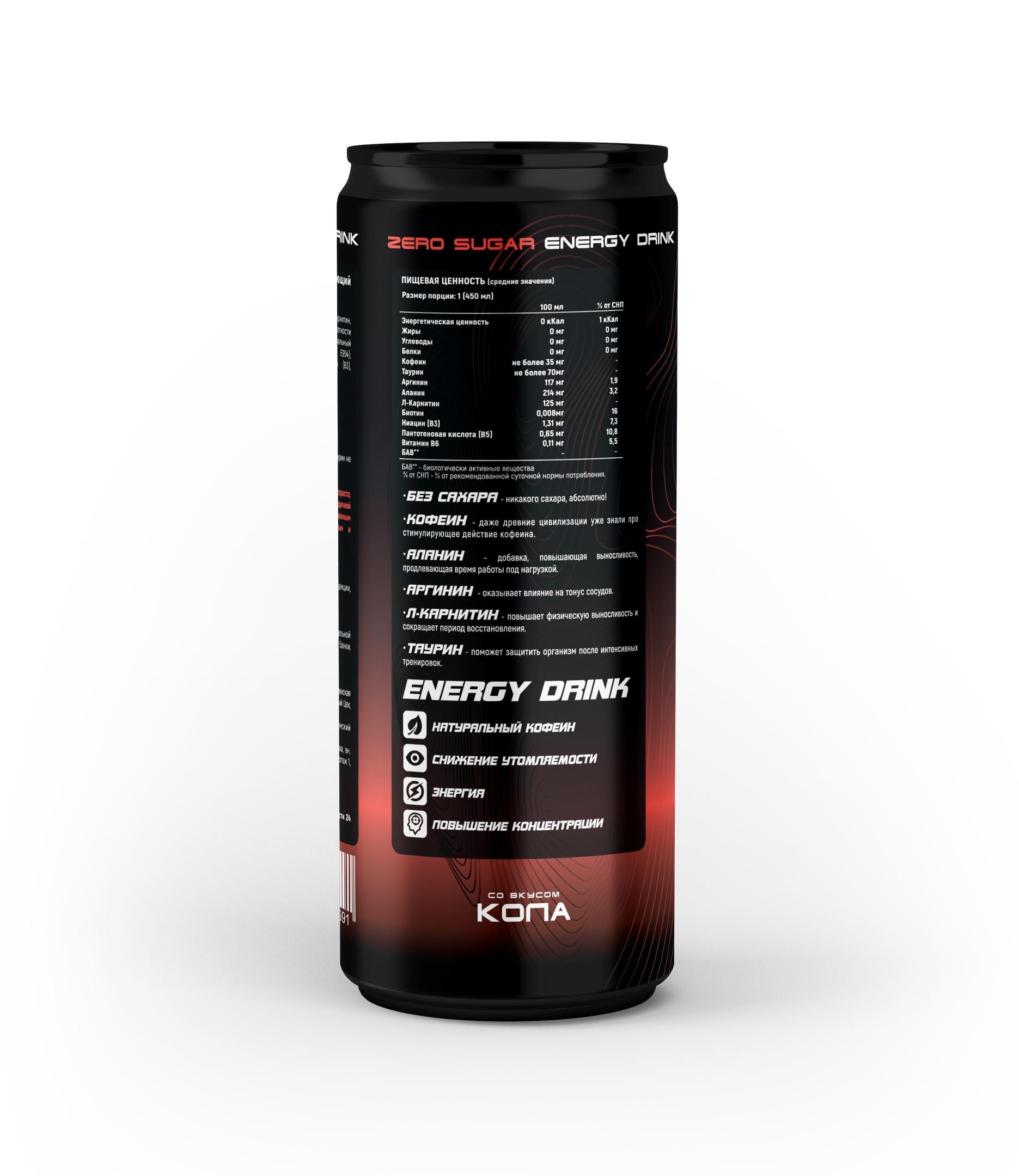 Энергетик изготавливают без добавления сахар. Содержит кофеин и аминокислоты. Компоненты быстро усваиваются в желудочно-кишечном тракте. Обеспечивают насыщение клеток энергией. Повышают двигательную активность и работоспособность.