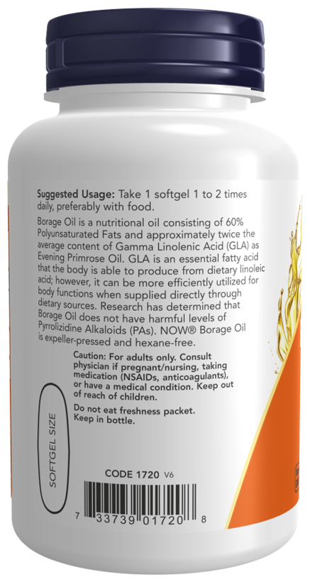 Масло бурачника - это питательное масло, содержащее 60% полиненасыщенных жиров и примерно в два раза больше гамма-линоленовой кислоты (ГЛК), чем масло примулы вечерней. ГЛК - это незаменимая жирная кислота, которую организм способен вырабатывать из поступающей с пищей линолевой кислоты. Но ГЛК используется организмом более эффективно, если поставляется напрямую из пищевых источников. Исследования показали, что масло бурачника не содержит вредных уровней пирролизидиновых алкалоидов (ПА). Масло бурачника от NOW получено путем механического отжима и не содержит гексана.