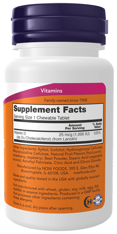 NOW Chewable Vitamin D-3 поставляет этот ключевой витамин во вкусной жевательной форме. Витамин D обычно поступает из рациона или вырабатывается кожей из ультрафиолетовой энергии солнца. Однако в пище его не так много. Поскольку все больше людей избегают пребывания на солнце, добавки витамина D становятся еще более необходимыми для обеспечения вашего организма достаточным его запасом.