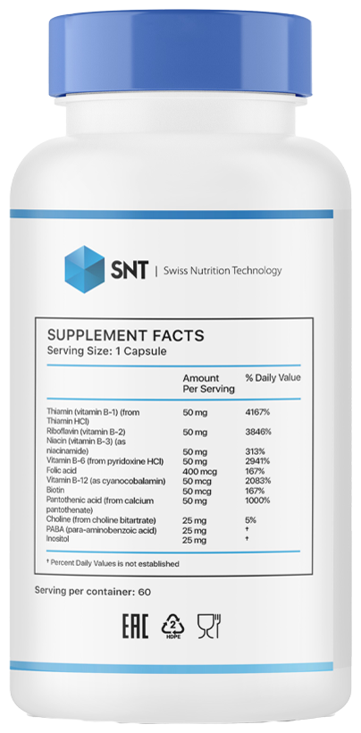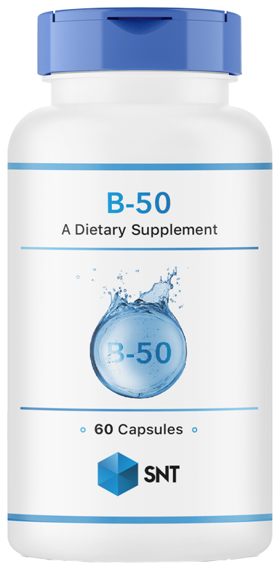 B-50 - это диетическая добавка, содержащая комплекс витаминов группы B. В составе B-50 обычно присутствуют витамины B1 (тиамин), B2 (рибофлавин), B3 (ниацин), B5 (пантотеновая кислота), B6 (пиридоксин), B7 (биотин), B9 (фолиевая кислота) и B12 (кобаламин), а также дополнительные питательные вещества.